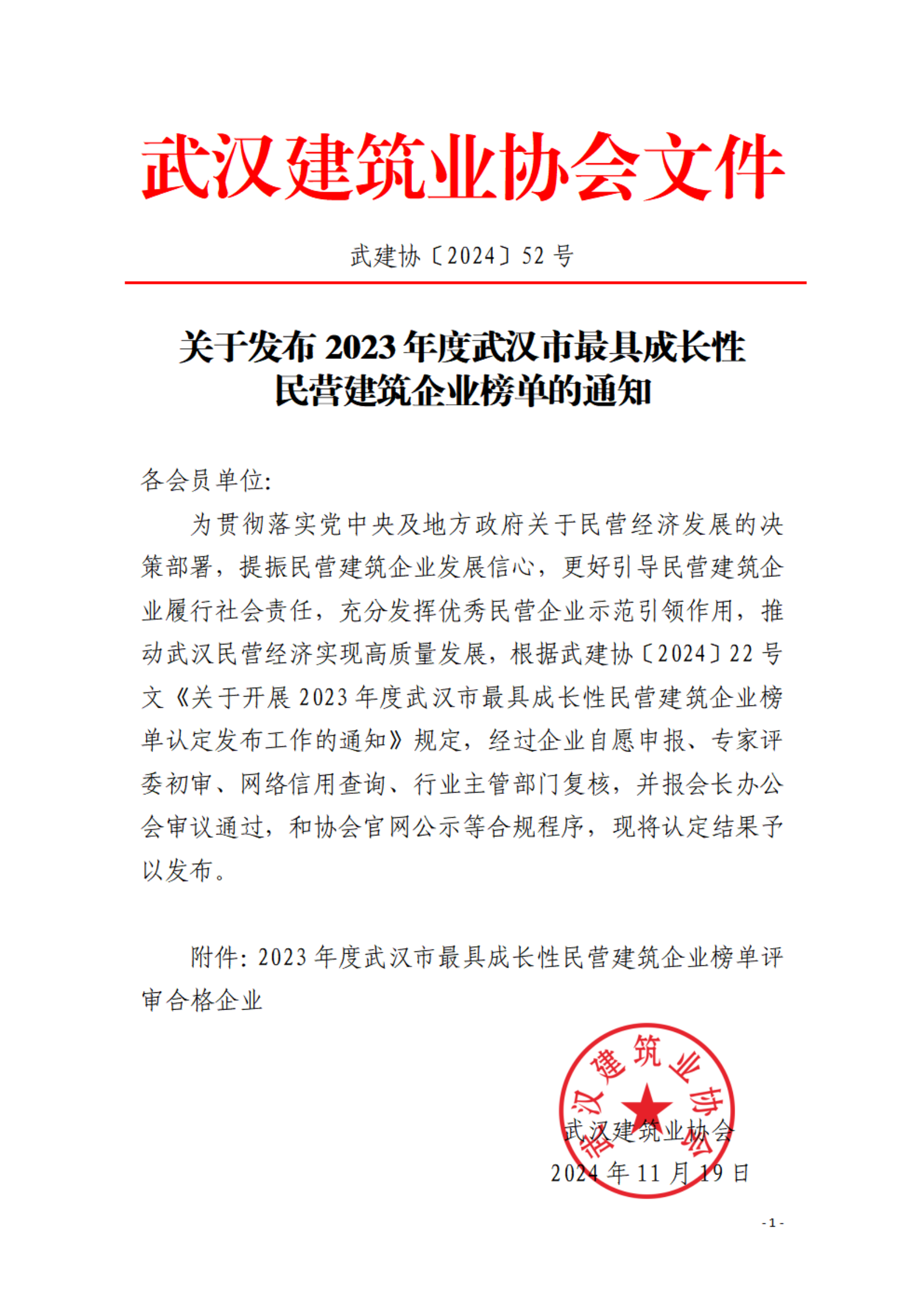 - 2024-11-22湖北省建工第五建設(shè)有限公司榮膺2023年度武漢市最具成長性民營建筑企業(yè)...[圖]